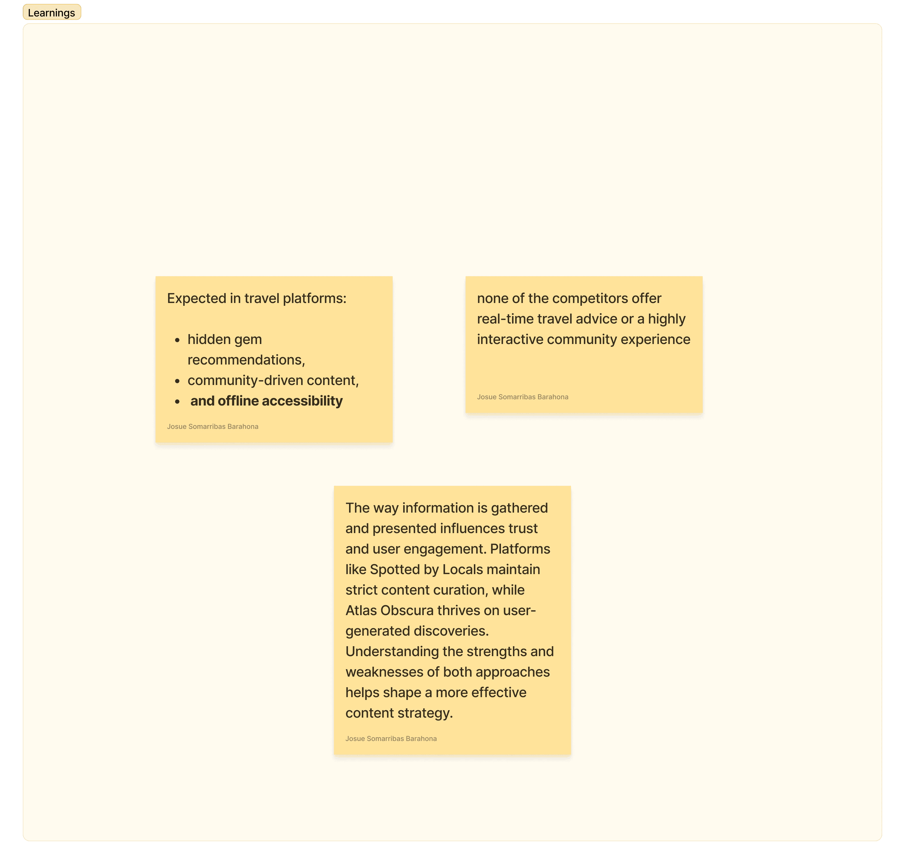 This competitor analysis has given a clear view of the travel platform market, showing what is standard, what is missing, and where there are opportunities. I identified both direct and indirect competitors, looking at their strengths and weaknesses. Then analyzed what makes each competitor unique and found common features that users expect. From this, I learned about common user frustrations and areas that need improvement. Finally, I discovered opportunities to innovate, such as offering real-time travel advice, AI-powered trip planning, and more interactive experiences.