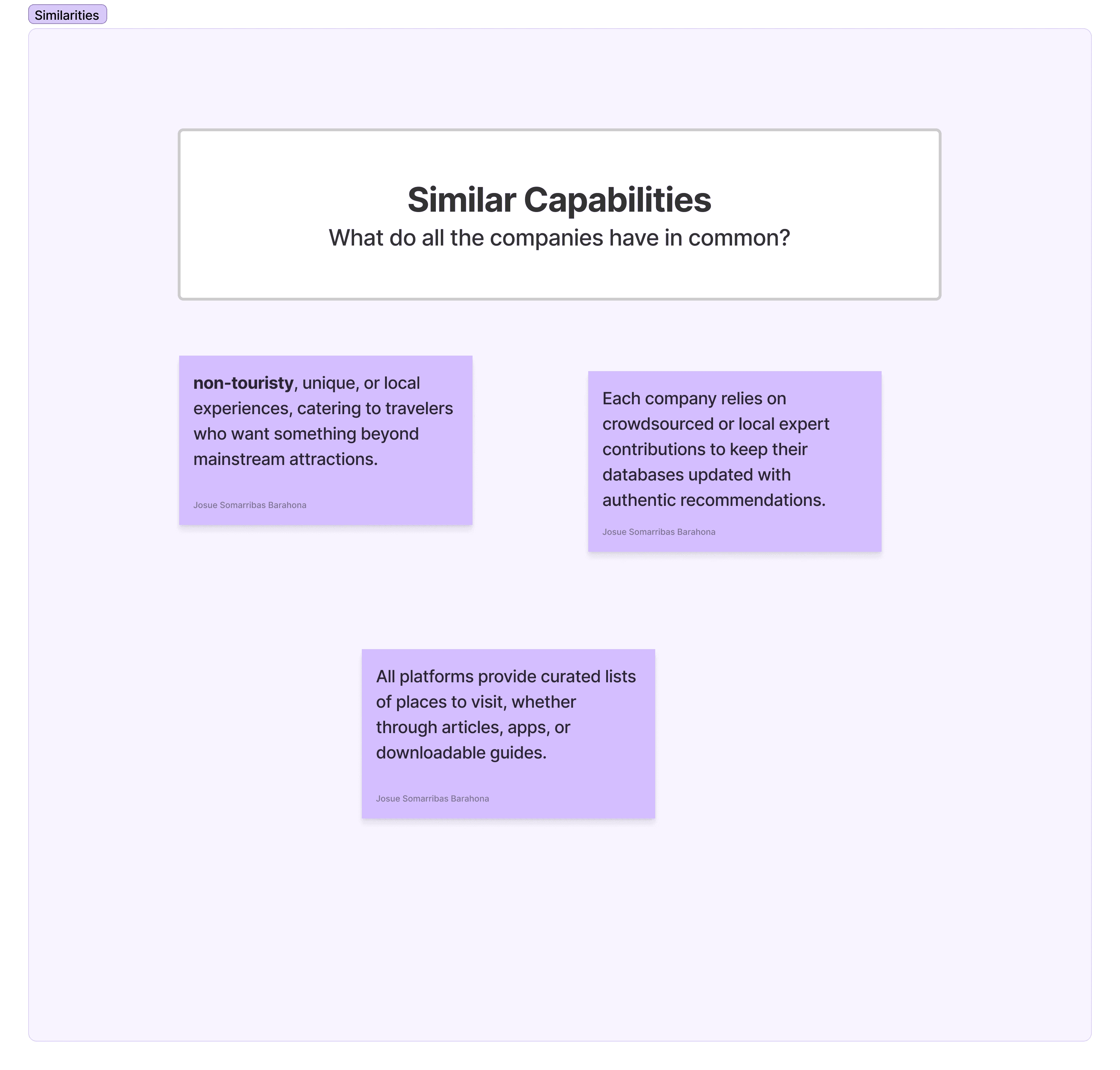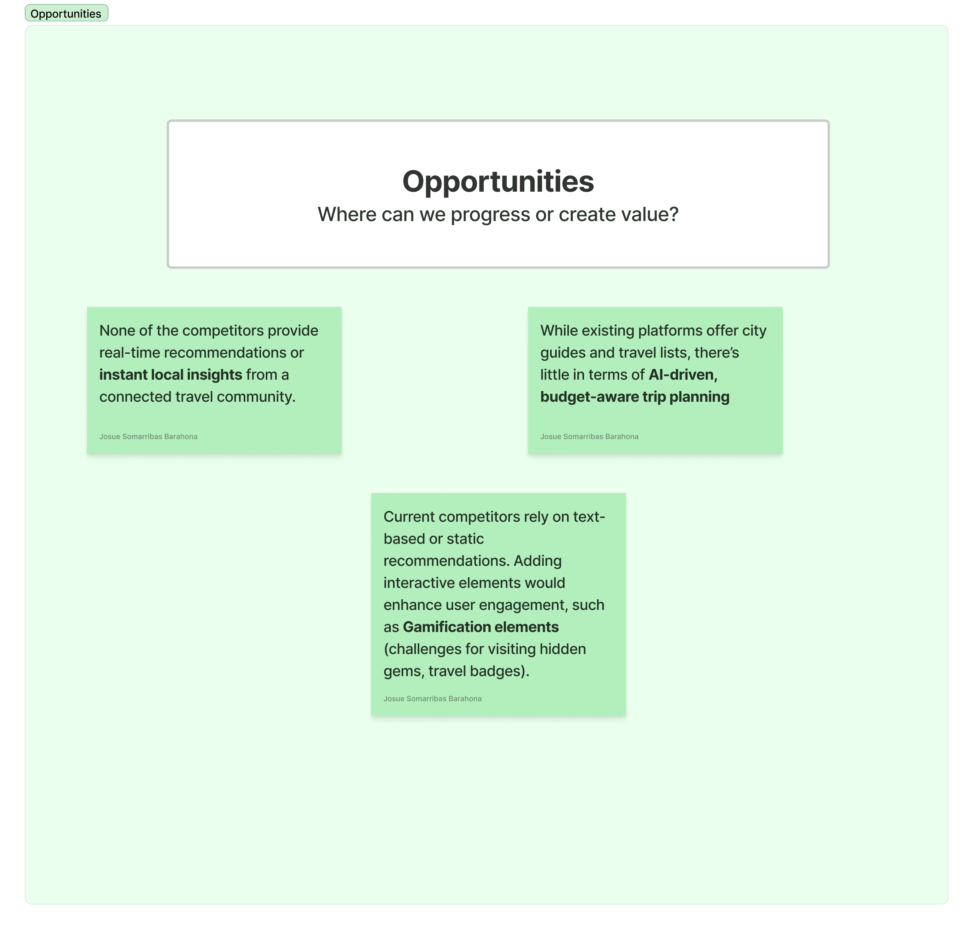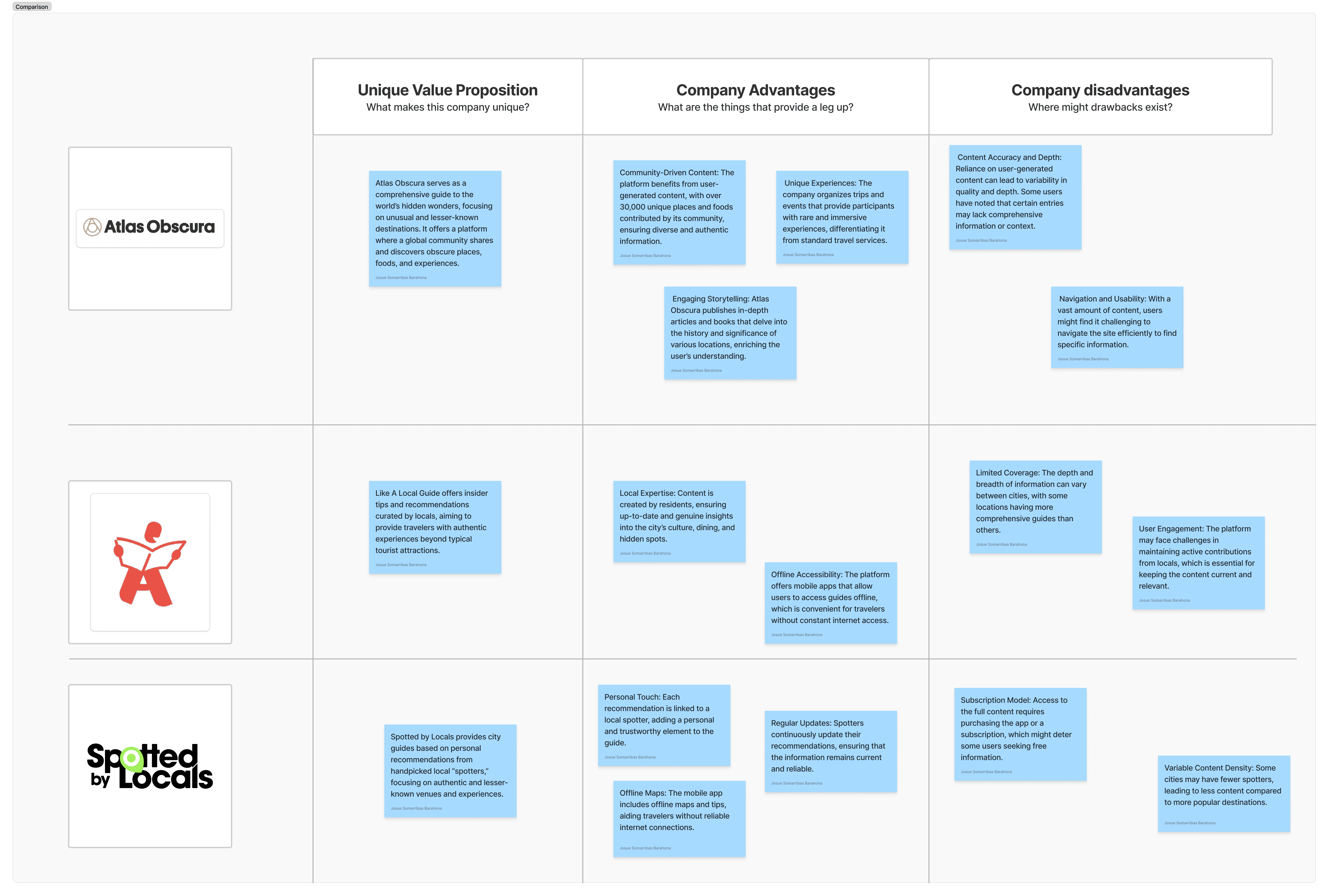 How to use it: Compare competitors’ UVPs to find common themes or unmet user needs. If all competitors focus on hidden places, maybe your advantage is real-time travel advice or budget-based planning.